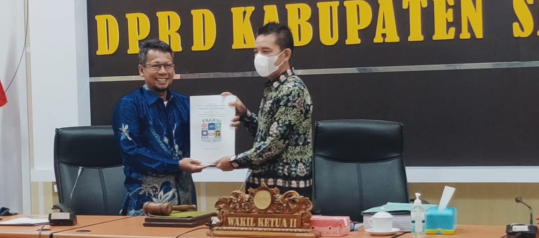 Foto : Anggota DPRD Seruyan Arahman (kiri) saat menyerahkan secara simbolis pemandangan umum Fraksi Kedesa Ampera kepada Wakil Ketua II DPRD, Seruyan M. Aswin (kanam) dalam rapat paripurna, Jum'at 20 mei 2022.