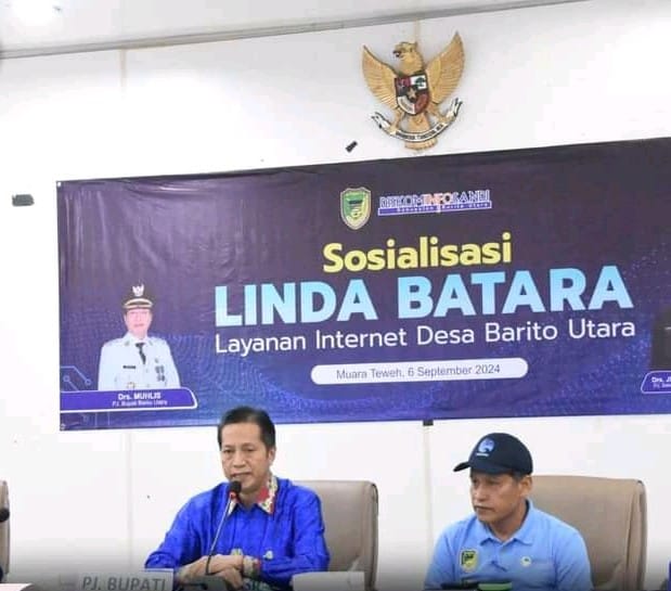 FAKTAKALTENG.COM – Muara Teweh – Sosialisasi LINDA BATARA dipimpin langsung oleh Pj. Bupati Barito Utara, Drs. Muhlis didampingi Kadis Diskominfo Sandi, Moch Ikhsan, Kepala Bidang E-Goverment Diskominfosandi, Munawar Khalil, dan dihadiri oleh Direktur Comerce PT Comtelindo, Fajar Aulia Rahmatullah serta 43 kepala desa yang terdaftar sebagai desa berstatus blankspot.