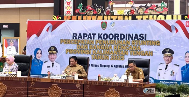 PURUK CAHU – Bupati Murung Raya (Mura), Heriyus melalui Wakil Bupati (Wabup) Mura, Rahmanto Muhidin menghadiri Rapat Koordinasi (Rakor) Percepatan Penurunan Stunting dan Bangga Kencana. Kegiatan ini dilaksanakan di Aula Jayang Tingang, Kantor Gubernur Kalteng, Selasa (12/8/2025).